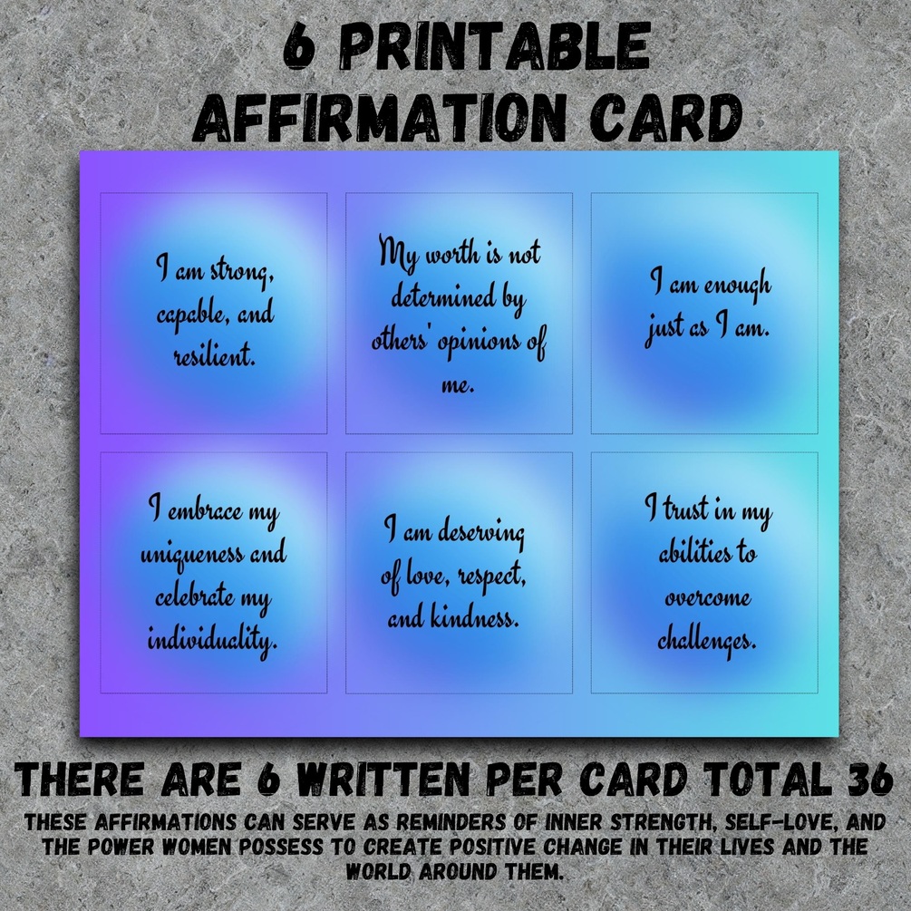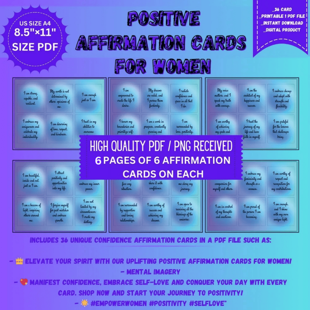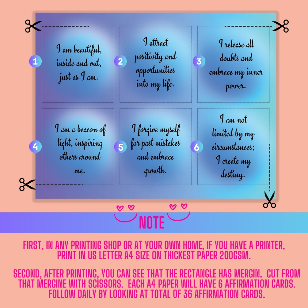 - Provided: You will receive, 1 PDF (6 pages) file and 6 JPG Images. 6 per page, total 6x6= 36 affirmation cards for Women.