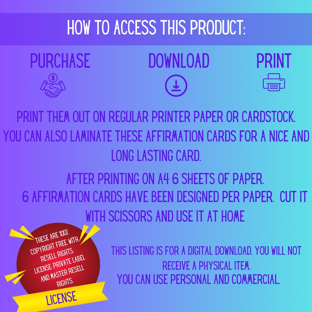 (A) You can access the Printable Positive Affirmation Cards as soon as your purchase is completed. You're going to get these Printable Positive Affirmation Cards for Lifetime Access. You'll have access that never expires.