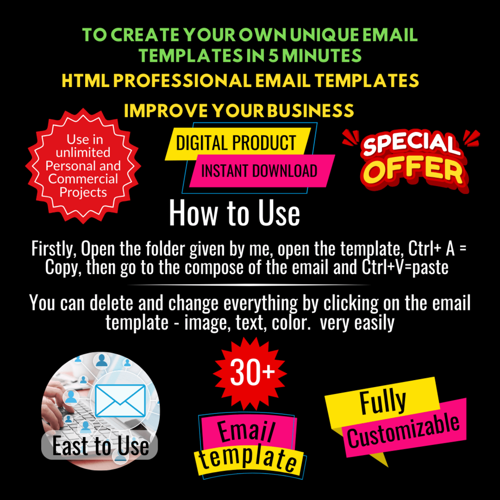 - Provided: You will receive, 30 email templates with Source file and A video link has been attached showing how to edit step by step.