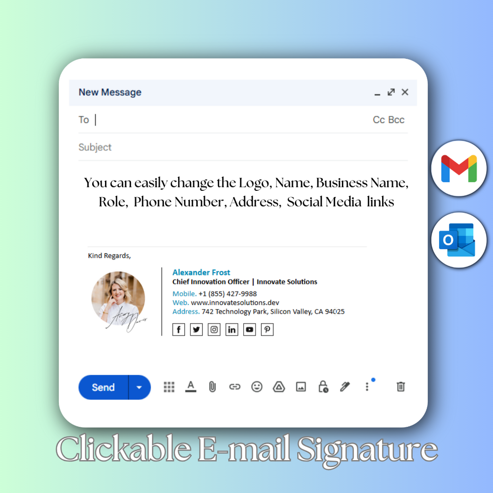 (A) Even if you have no knowledge of HTML code, you can use these templates in your email signature. Only for Gmail and Outlook, you can use them. You can make changes to email signature templates by copy-paste, once you follow the step-by-step guide you can use it very easily in a few seconds. Once saved, your professional signature will automatically appear at the end of all your outgoing emails, giving them a polished and branded look.