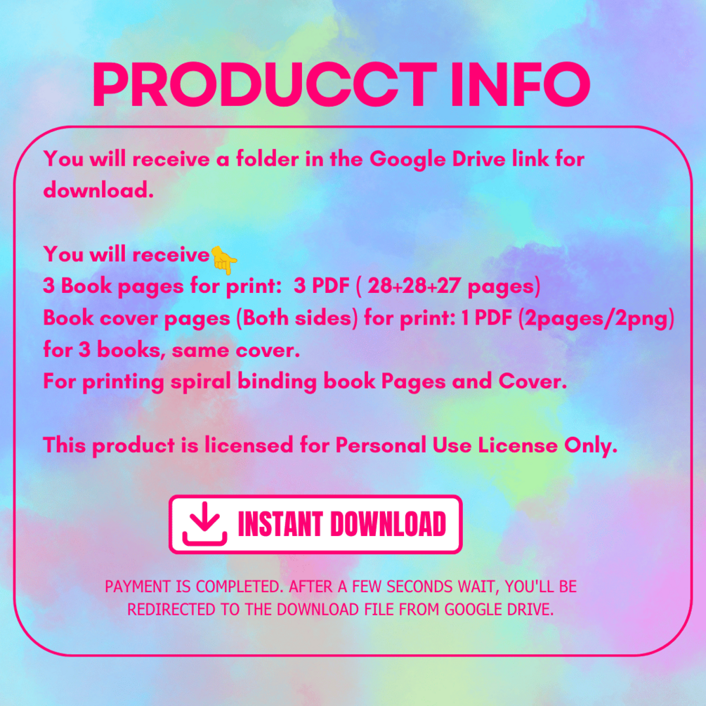 - Provided: You will receive, 3 book pages for print: 3 PDF ( 28+28+27 pages) book cover pages (Both sides) for print: 1 PDF (2pages/2png) for 3 books, same cover. for printing spiral binding book pages and cover.
