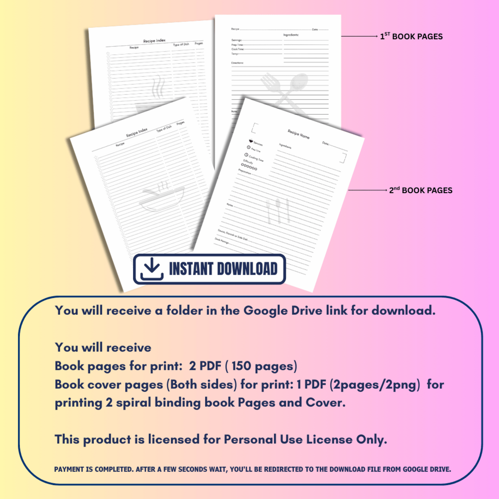- Provided: You will receive book pages for print: 2 PDF ( 150 pages) and book cover pages (Both sides) for print: 1 PDF (2pages/2png) for printing 2 spiral binding book Pages and Cover.